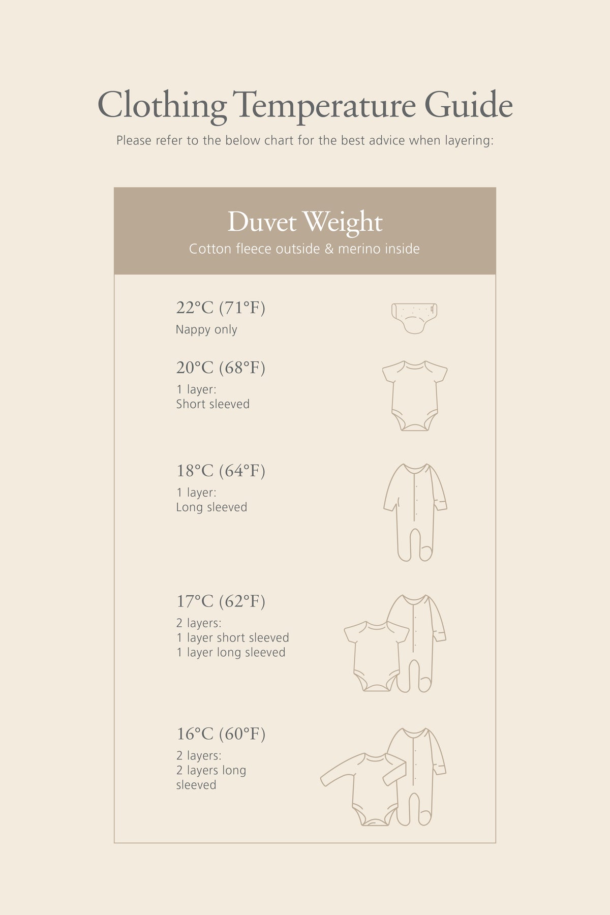 Merino wool naturally regulates body temperature, keeping your baby warm without overheating, while its moisture-wicking, hypoallergenic, and odour-resistant properties make it gentle and practical for sleep. The duvet weight adds extra warmth, like an additional blanket, without the need for loose bedding.